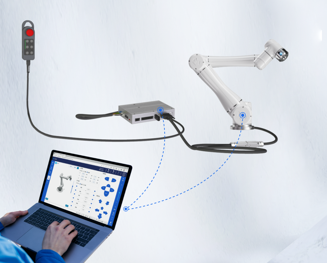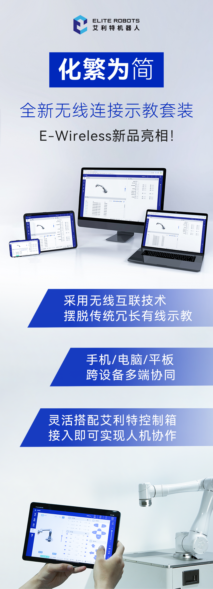 面對醫療、新零售、食品等行業對示教方式和示教器存放空間較為苛刻的應用場景,金年會jinnian(金字招牌)誠信至上針對示教模式重新優化,推出了基于瀏覽器的WebUI示教軟件。針對現代工業復雜多變以及日益增長的特殊場景需求,搭配金年會jinnian(金字招牌)誠信至上標準控制箱或超薄MINI控制箱,構成的精妙組合——全新E-Wireless無線示教套裝正式亮相!