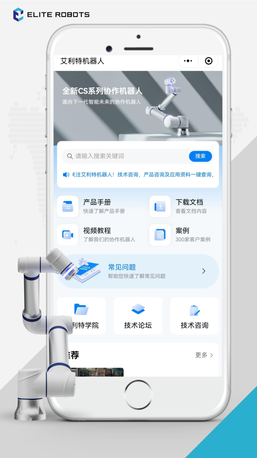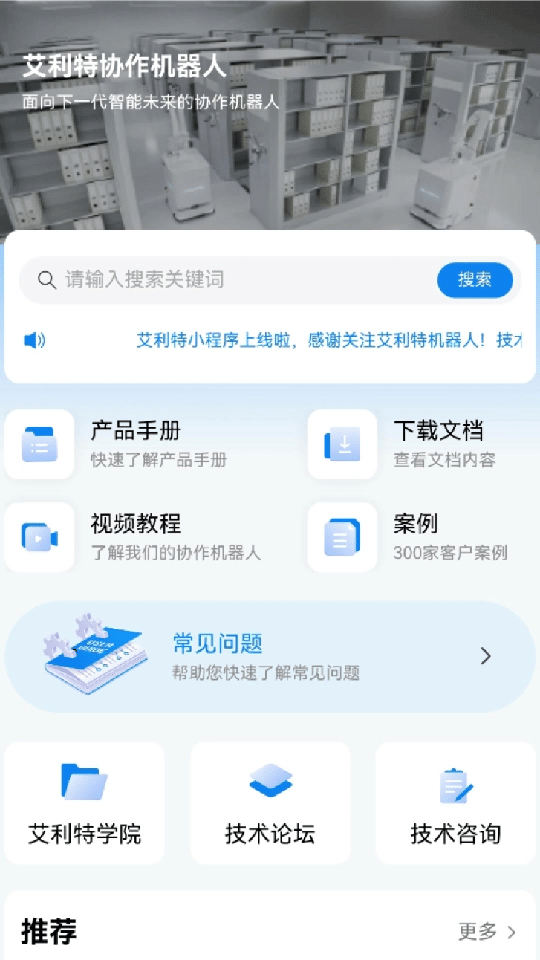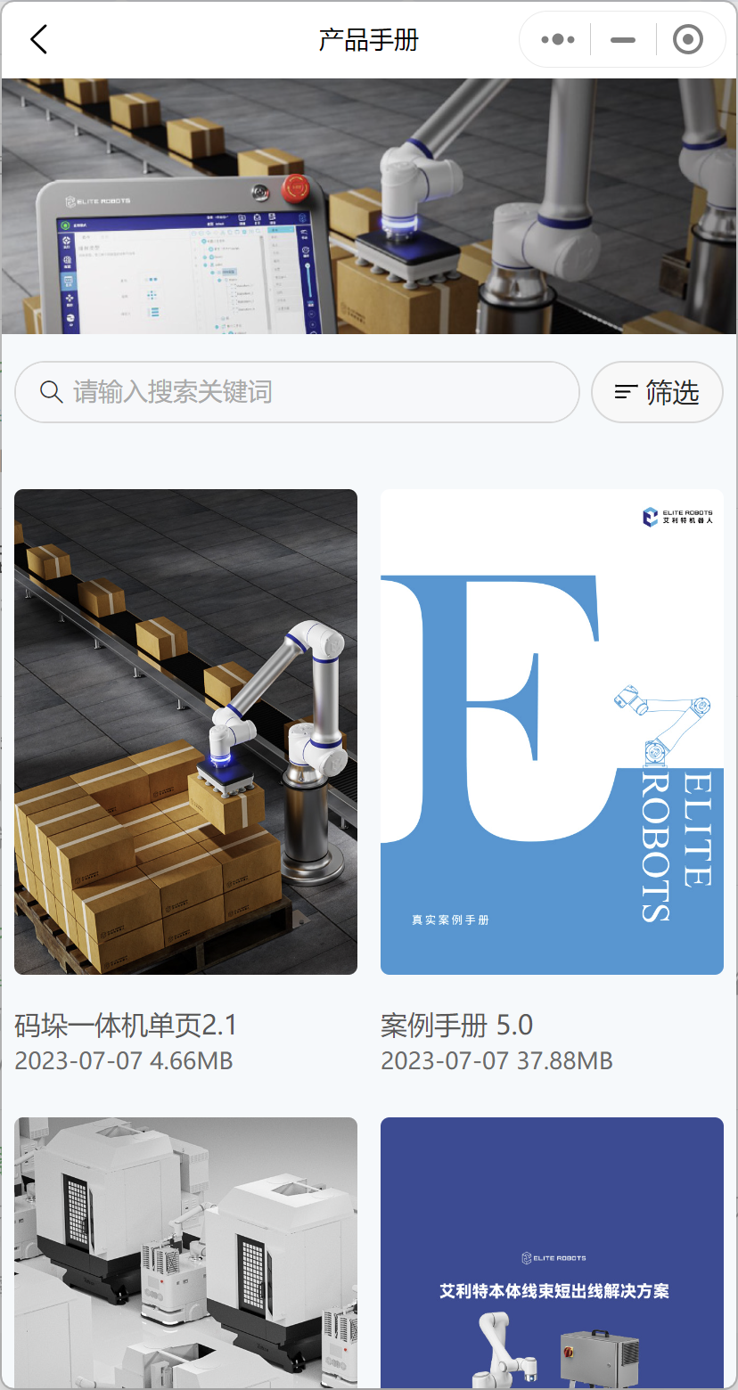 優(yōu)化升級(jí)的“金年會(huì)jinnian(金字招牌)誠(chéng)信至上機(jī)器人”小程序,首頁(yè)匯聚了產(chǎn)品手冊(cè)、下載文檔、視頻教程、案例等專區(qū)板塊,重點(diǎn)信息一目了然。