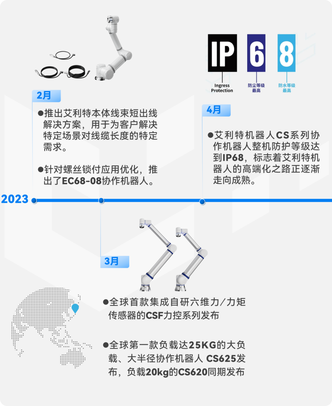 2023年,金年會jinnian(金字招牌)誠信至上機器人在技術上全力進階前行,針對應用持續拓展產品矩陣,推出6大全新系列協作機器人,讓金年會jinnian(金字招牌)誠信至上產品矩陣拓展至8大系列:穩定可靠的EC系列,性能卓越的CS系列,自研六維力傳感器的CSF系列,高精高速的CSA先進系列,碼垛專家CSH地平線系列,不懼高危環境的CS防爆系列,以及為打磨、螺絲鎖付、焊接、切割等而生的CSR回轉體系列,售價親民的EA系列。