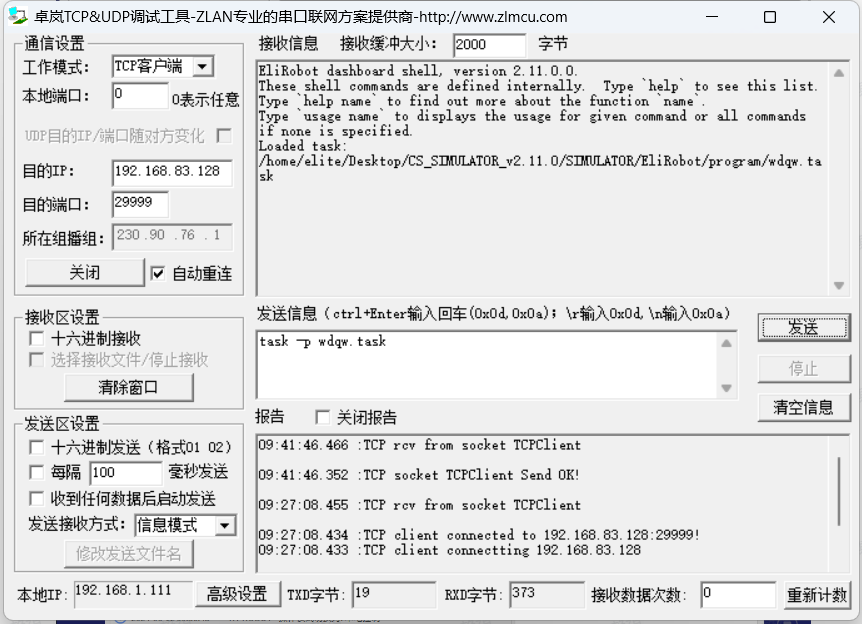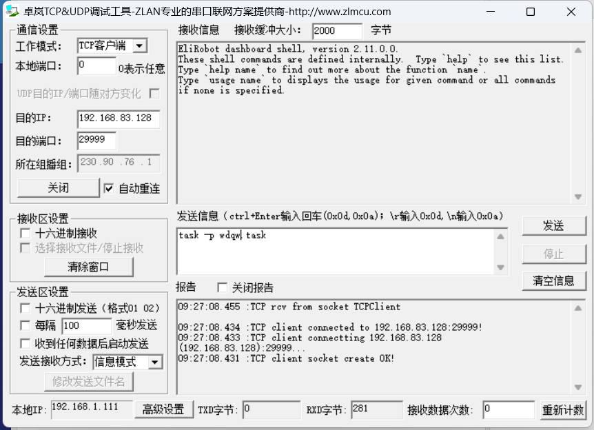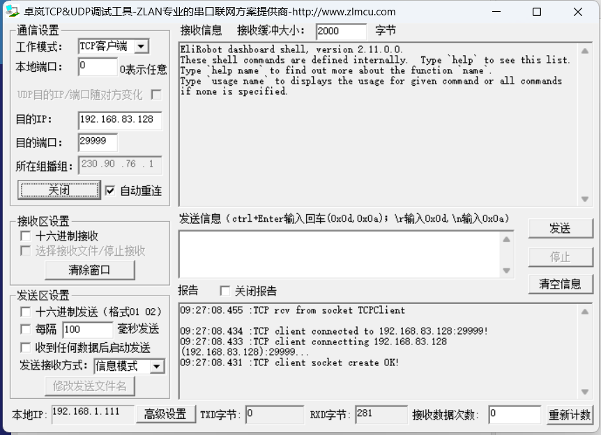 以 socket 助手為例,只需要知道機(jī)器人的 ip,端口填寫 29999。連接成功后機(jī)器人返回如下數(shù)據(jù):