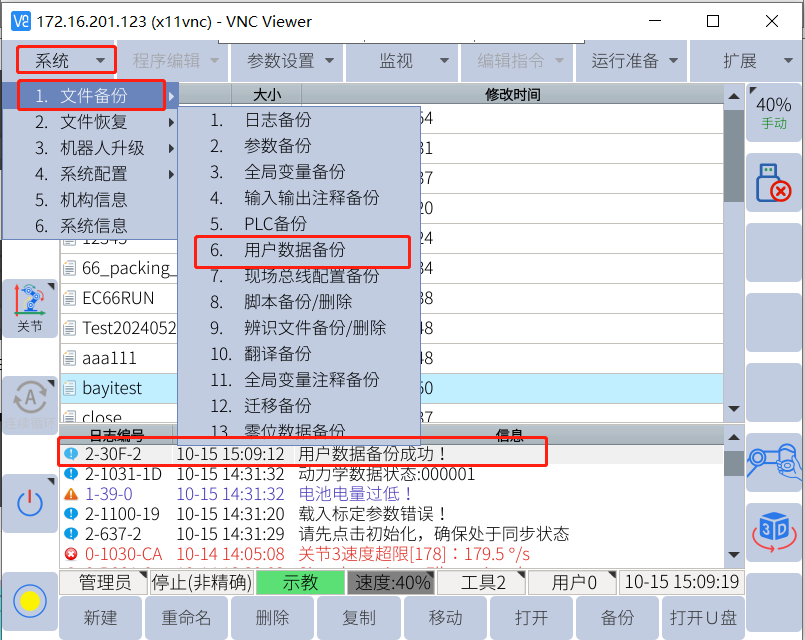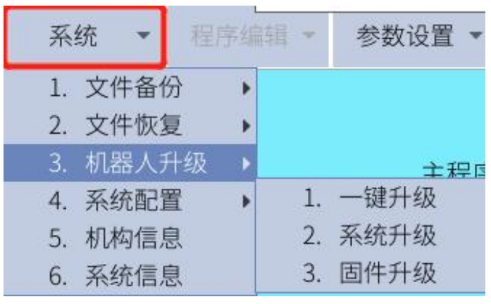 2.1.5 把U盤插到控制USB口上面,點擊系統---機器人升級----系統升級---選擇要升級的文件---點確定,等待幾分鐘升級完成后,系統會自動重啟。