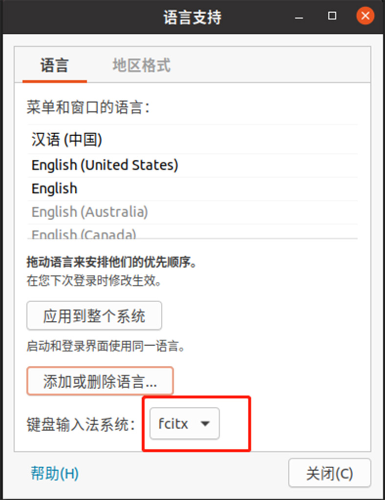 回到“語(yǔ)言支持”窗口,在鍵盤輸入法系統(tǒng)中,選擇“fcitx”