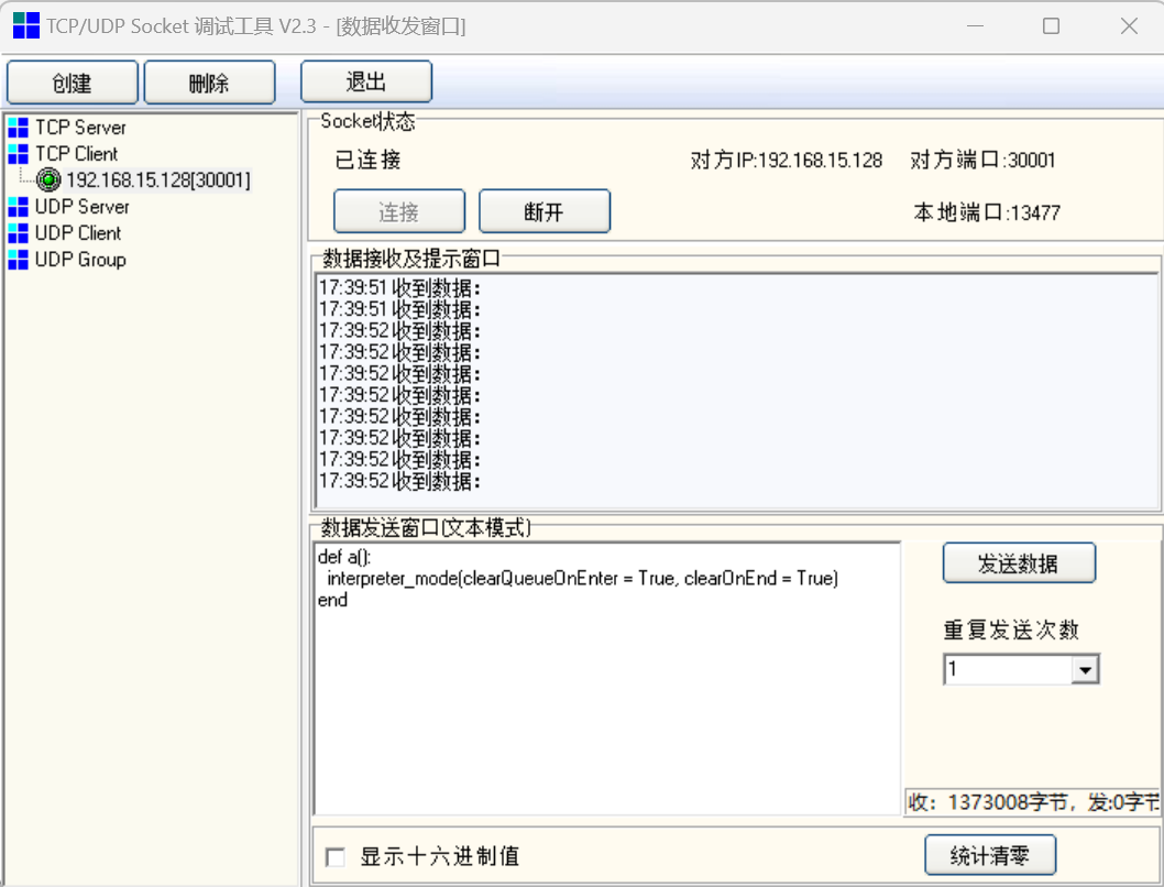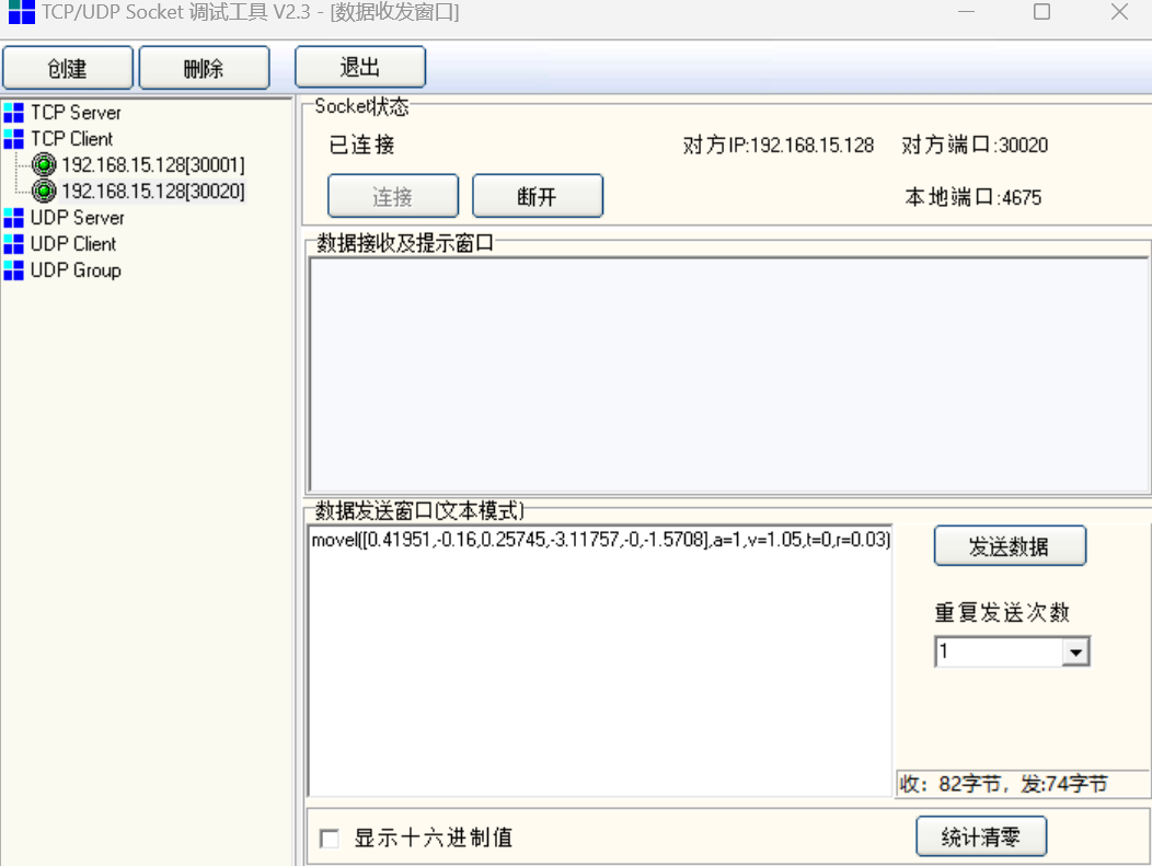 2. 用通訊助手創(chuàng)建一個(gè) 30001端口的客戶端,連接機(jī)器人并發(fā)送腳本使機(jī)器人進(jìn)入解釋器模式