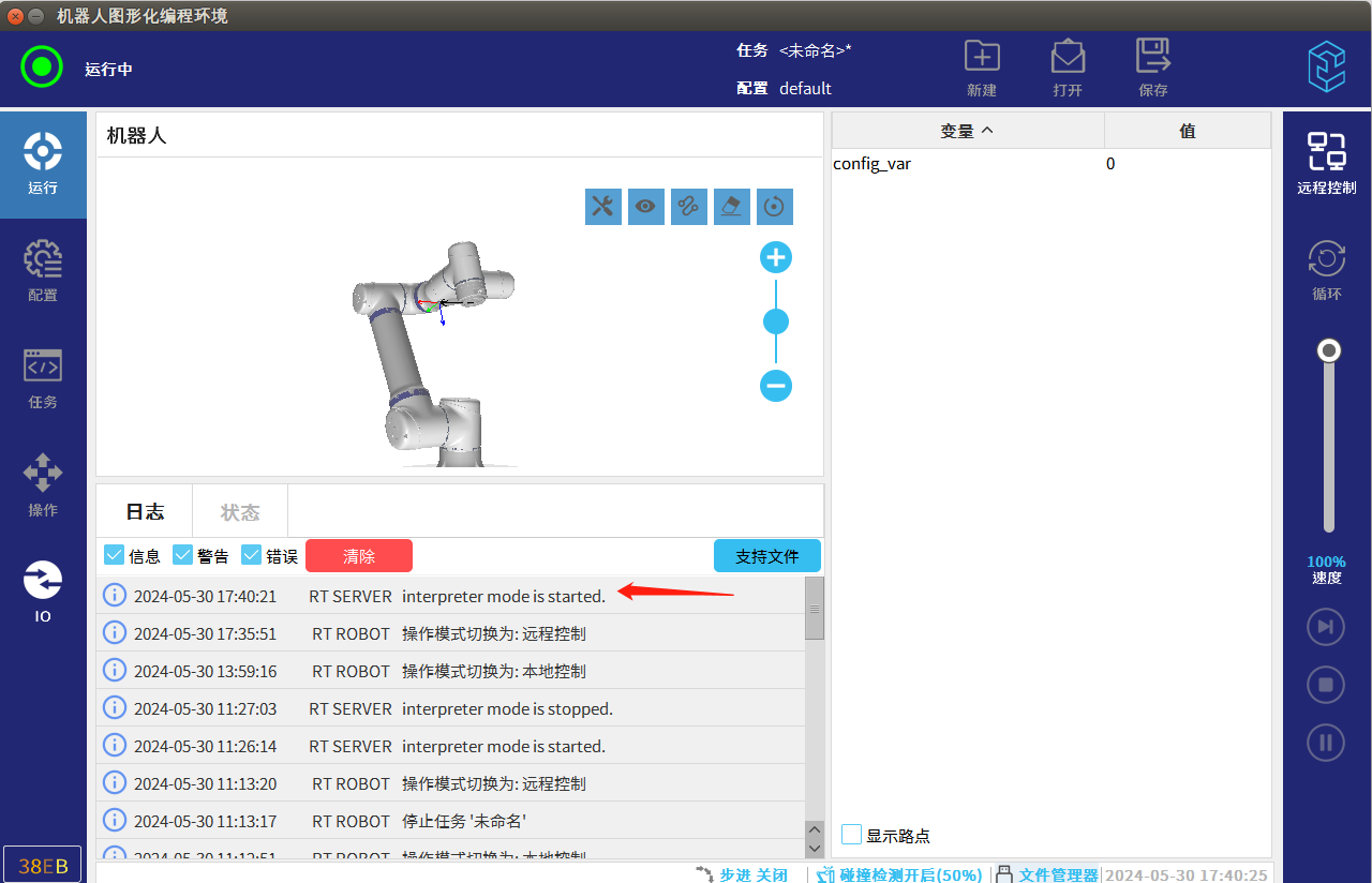 3.機(jī)器人進(jìn)入解釋器模式,示教器顯示運(yùn)行中,如下圖