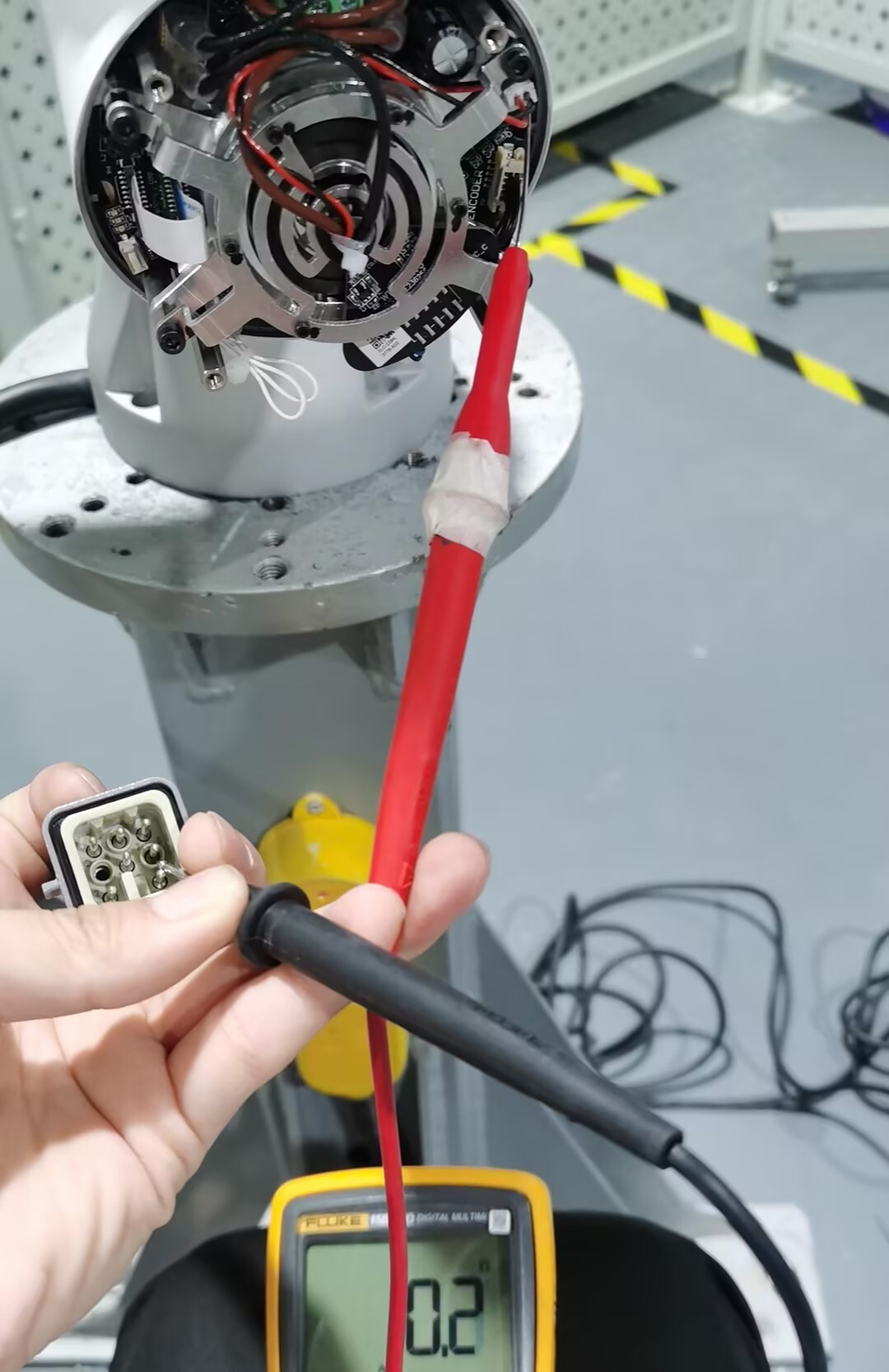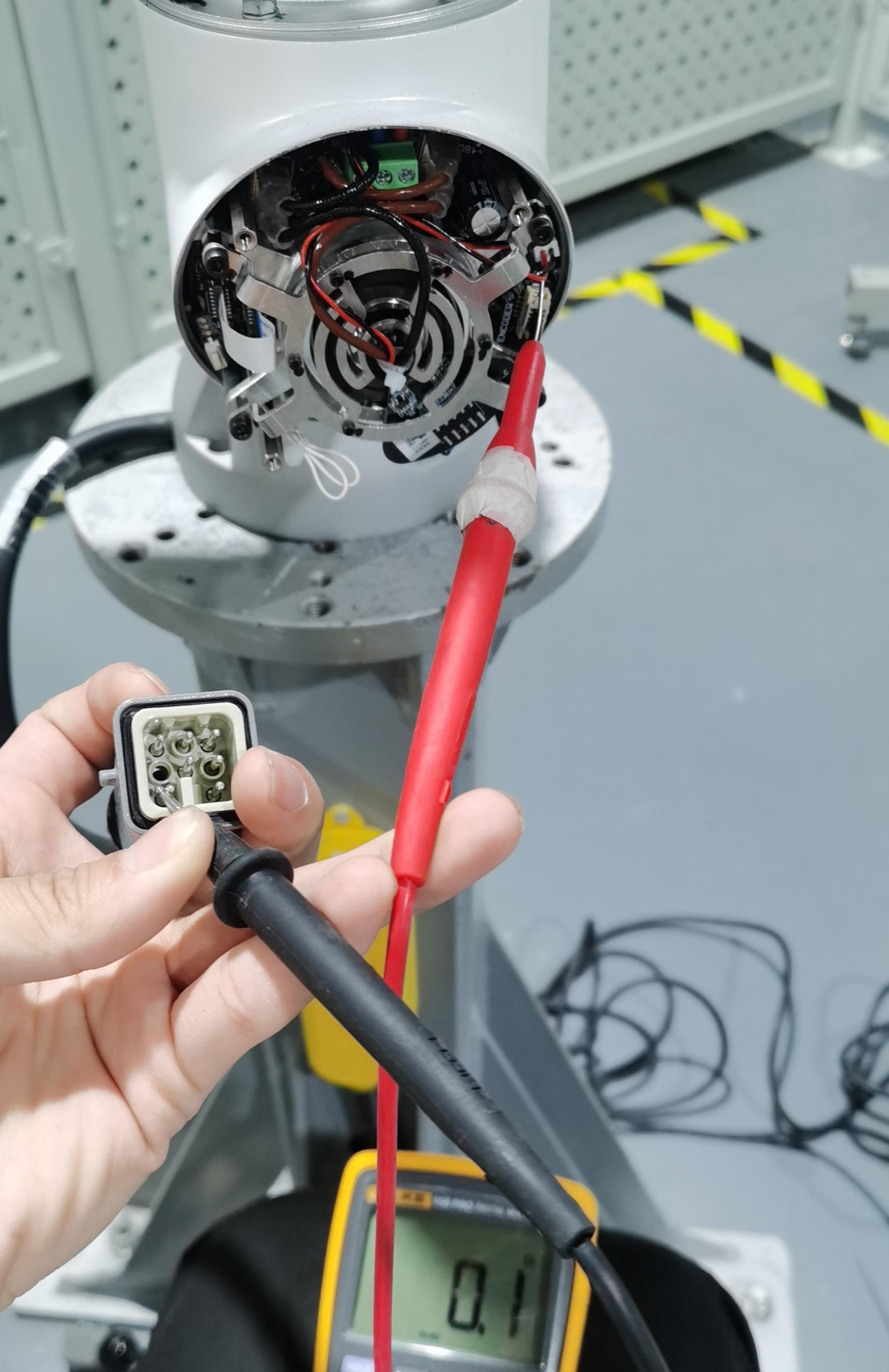 本體與控制柜連接,打開(kāi)任意關(guān)節(jié)端蓋,萬(wàn)用表打到歐姆檔,測(cè)量485+與485-電阻是 否在60歐姆左右,偏差太大或太小就有問(wèn)題.如果有問(wèn)題,測(cè)量?jī)蓚(gè)相鄰關(guān)節(jié)之間單線485+,單線485-的阻值,值在1歐姆左右即可