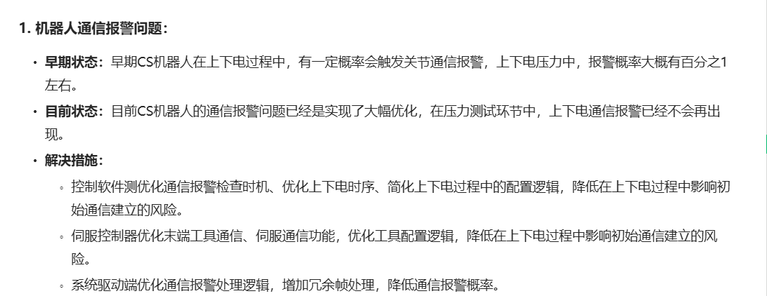 (14)是確實(shí)通信質(zhì)量比較差,不定期的偶發(fā)通信,這種可能是硬件存在問(wèn)題,此類報(bào)警如果還伴隨這樣的日志產(chǎn)生,那可以明確通信質(zhì)量有問(wèn)題。可以先嘗試通信插拔通信線,航插等接口,然后再驗(yàn)證是否還存在問(wèn)題。持續(xù)存在的話,可能就是硬件故障了。