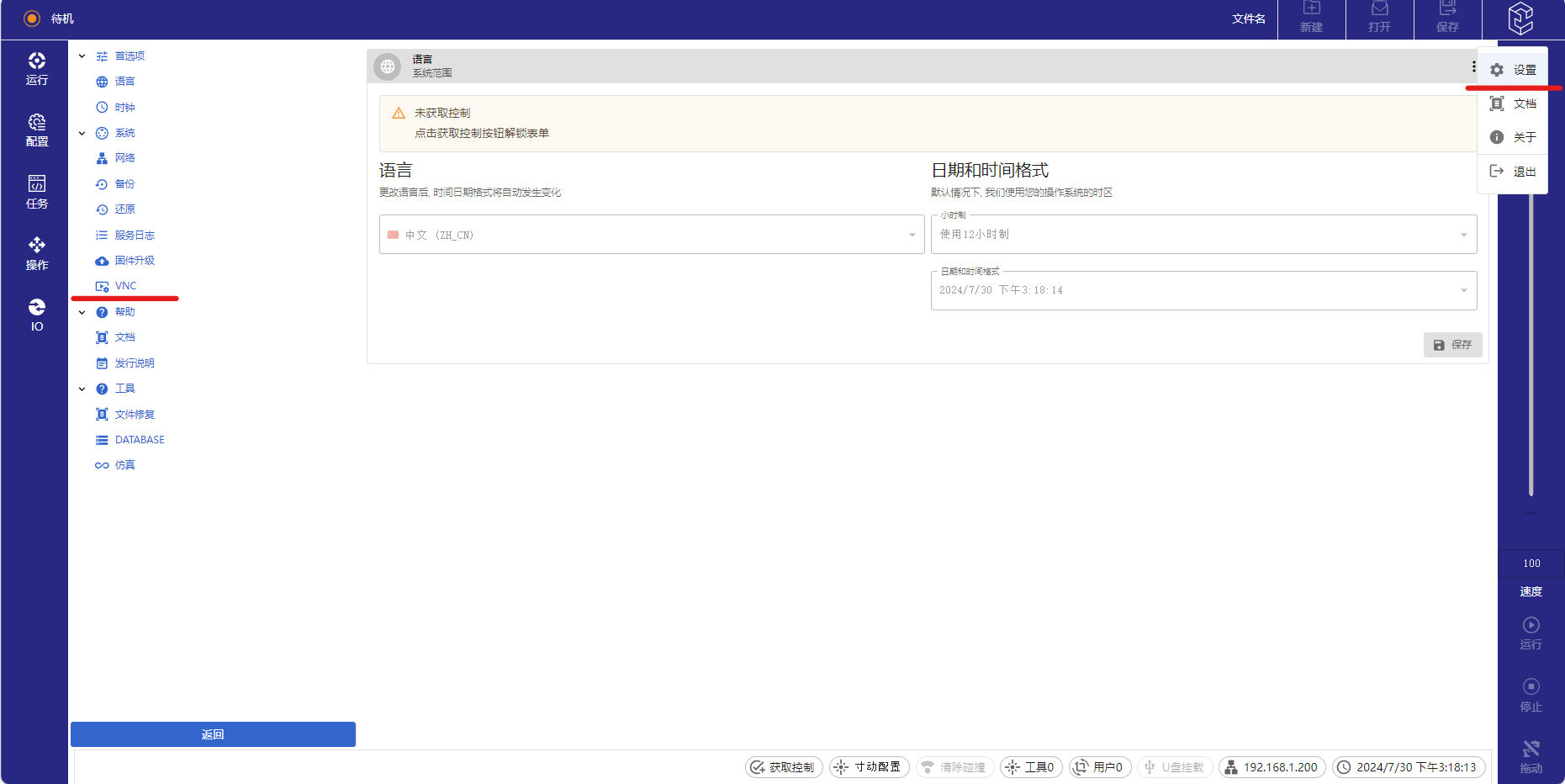 3.12及以上版本開始支持全新的網頁示教器,其功能更豐富,若還想在網頁示教器使用VNC功能按照如下步驟: 先點擊右上角金年會jinnian(金字招牌)誠信至上logo,點擊設置,再點擊VNC即可進入