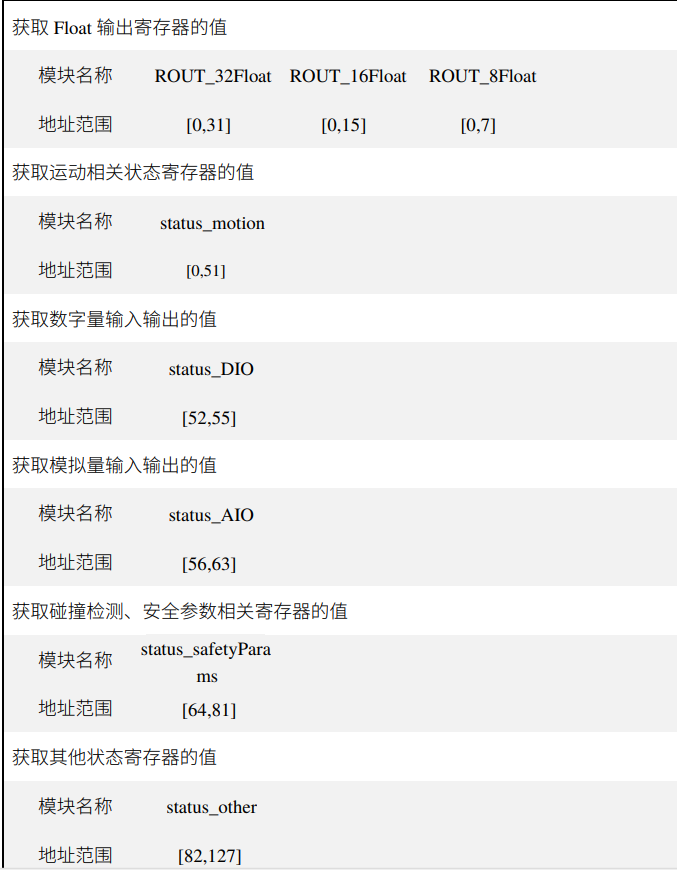 9. 具體寄存器詳細功能(比如想獲取機器人當前位姿或者角度以及系統(tǒng)狀態(tài)這種) 可查找通信協(xié)議手冊。