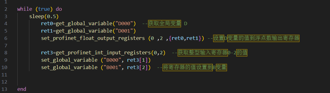此腳本為簡單的示例腳本,機器人將D變量浮點數(shù)傳到PLC對應(yīng)地址前兩個寄存器,plc將兩個正整數(shù)傳入機器人B變量。更多腳本指令,請查找EC腳本手冊profinet通訊章節(jié)。