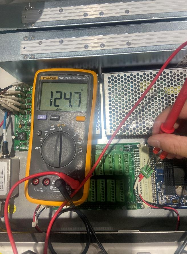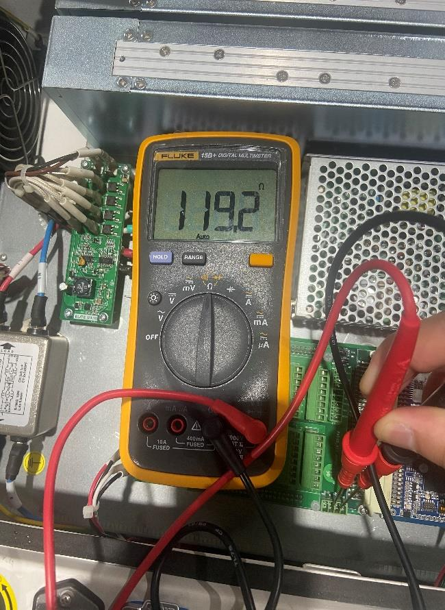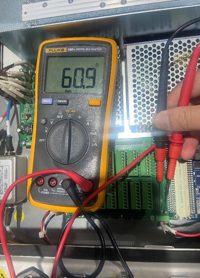 4. 萬用表測量控制柜 I/O 板上 485 母座和本體端子阻抗都為 120 歐姆左右為正常值(兩端連接阻抗值各60 歐),若 I/0 板端阻抗值異常可能是 I/0 板故障。