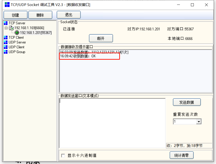 機器人觸發發送數據后,會給服務器發送設定的字符串,服務器會顯示接收到的數據