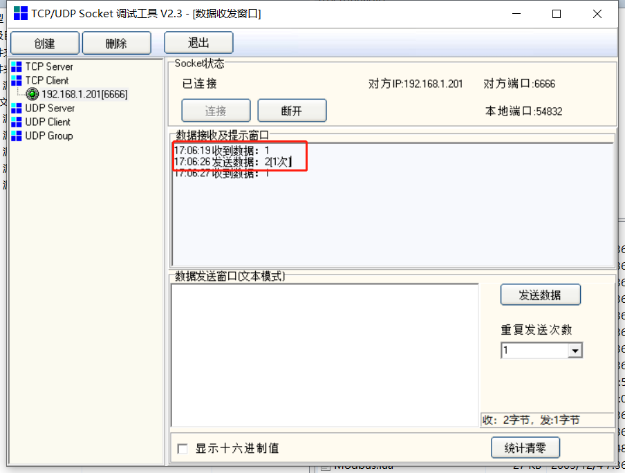 客戶端發送字符串“2”給機器人,機器人接收到數據把數據和接收到的數量打印出來