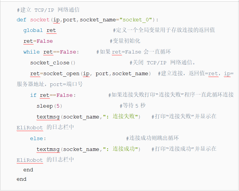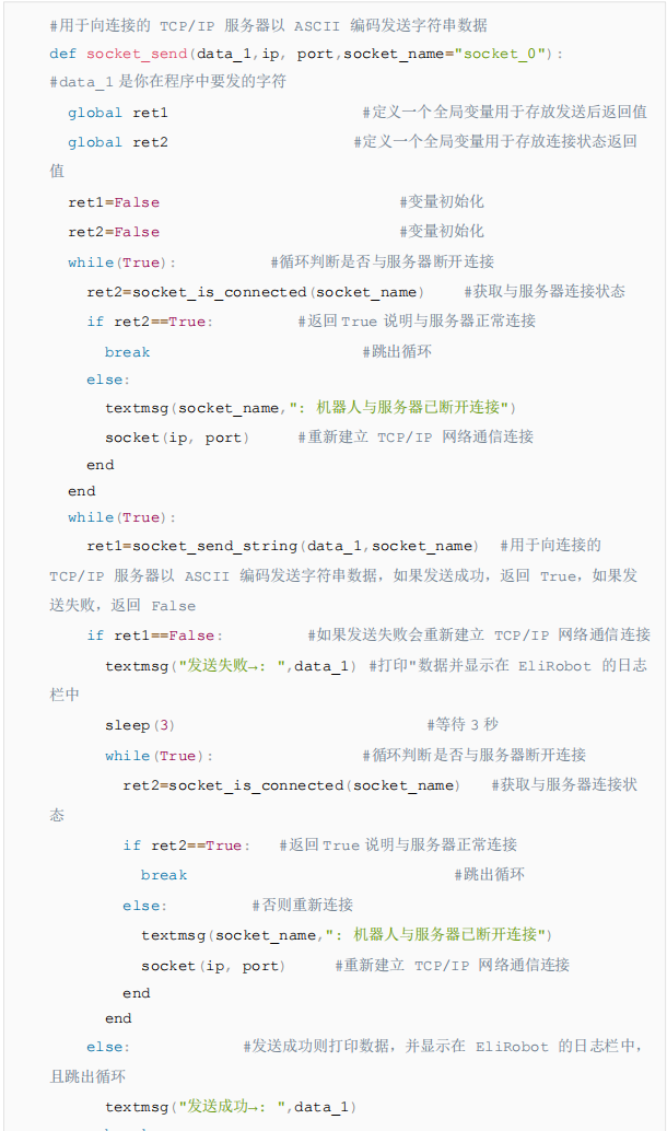 2.為了避免圖2-1的情況發生,我們可以利用發送指令的返回時作為判斷是否發送成功,發送失敗時一直發送直到發送成功為止,發送失敗的情況一般都是機器人客戶端與服務器斷開連接時出現的,所以我們可以在發送前和發送失敗后通過“socket_is_connected()”判斷與服務器連接的狀態如果斷開重新連接再次發送,如圖2-2所示,可以用下面代碼2-1配合圖2-3的圖形化編程直接調用df腳本實現此操作。