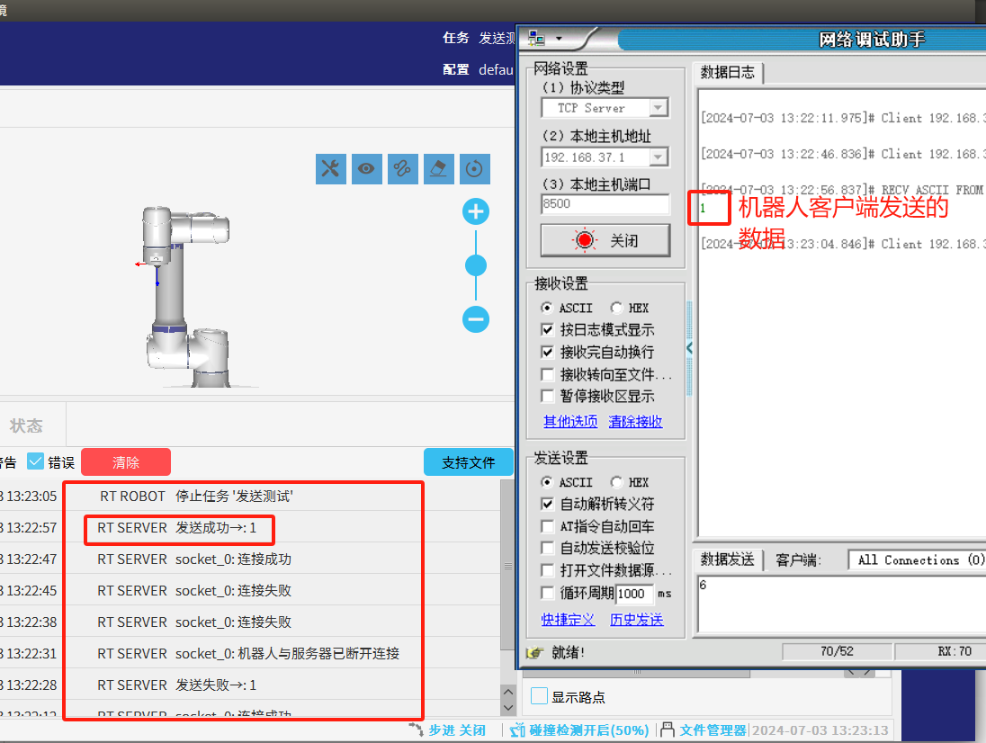 3 當服務器打開時機器人客戶端連接成功后會打印到“連接成功“EliRobot 的日志欄中如圖1-3所示,可以用下面代碼1-1配合圖1-4的圖形化編程直接調用df腳本實現此操作。