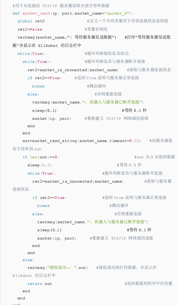 2.為了避免以上a.b兩種情況發生,我們可以在接收數據之前通過“socket_is_connected()”判斷與服務器連接的狀態如果斷開重新連接,并通過再次接收接收指令例如“socket_read_string(timeout=2)”的返回值判斷是否接收到數據,返回值為0時,再次接收數據,如圖3-3所示,以用下面代碼3-1配合圖3-3的圖形化編程直接調用df腳本實現此操作。
