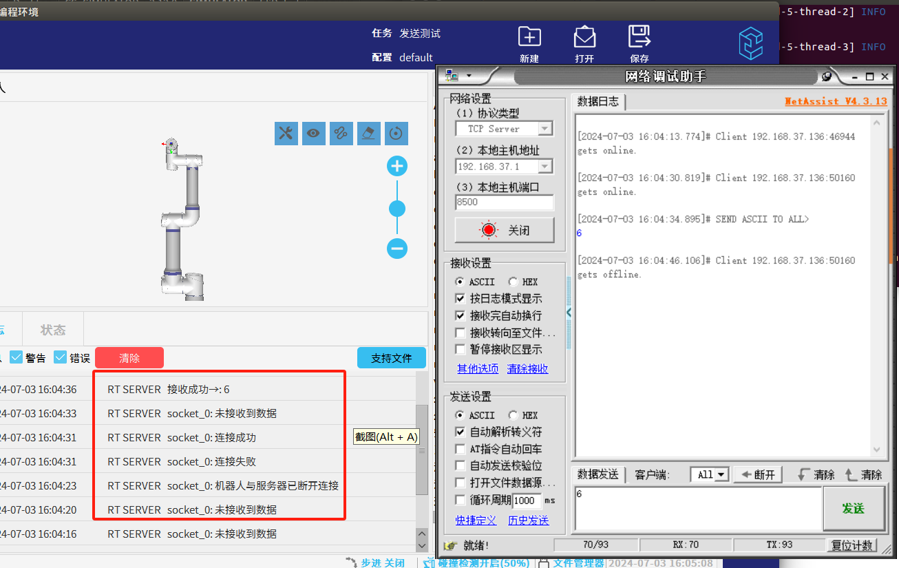 1.我們單純的使用發送指令例如:socket_send_string(str, socket_name="socket_0")未判斷發送是否成功時,如果當機器人客戶端當時已經與服務器斷開連接了或發送失敗后程序依然往下繼續運行,如圖2-1所示。