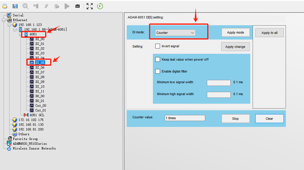 點擊下方6051,會彈出輸入密碼,密碼為00000000,然后依次配置下列接口類型,完成后點擊后面Apply mode.