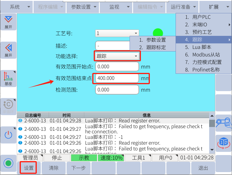 有效范圍開始點:有效范圍開始點設置不同的值后,機器人跟蹤時會在距離起點相應的距離開始進行跟蹤