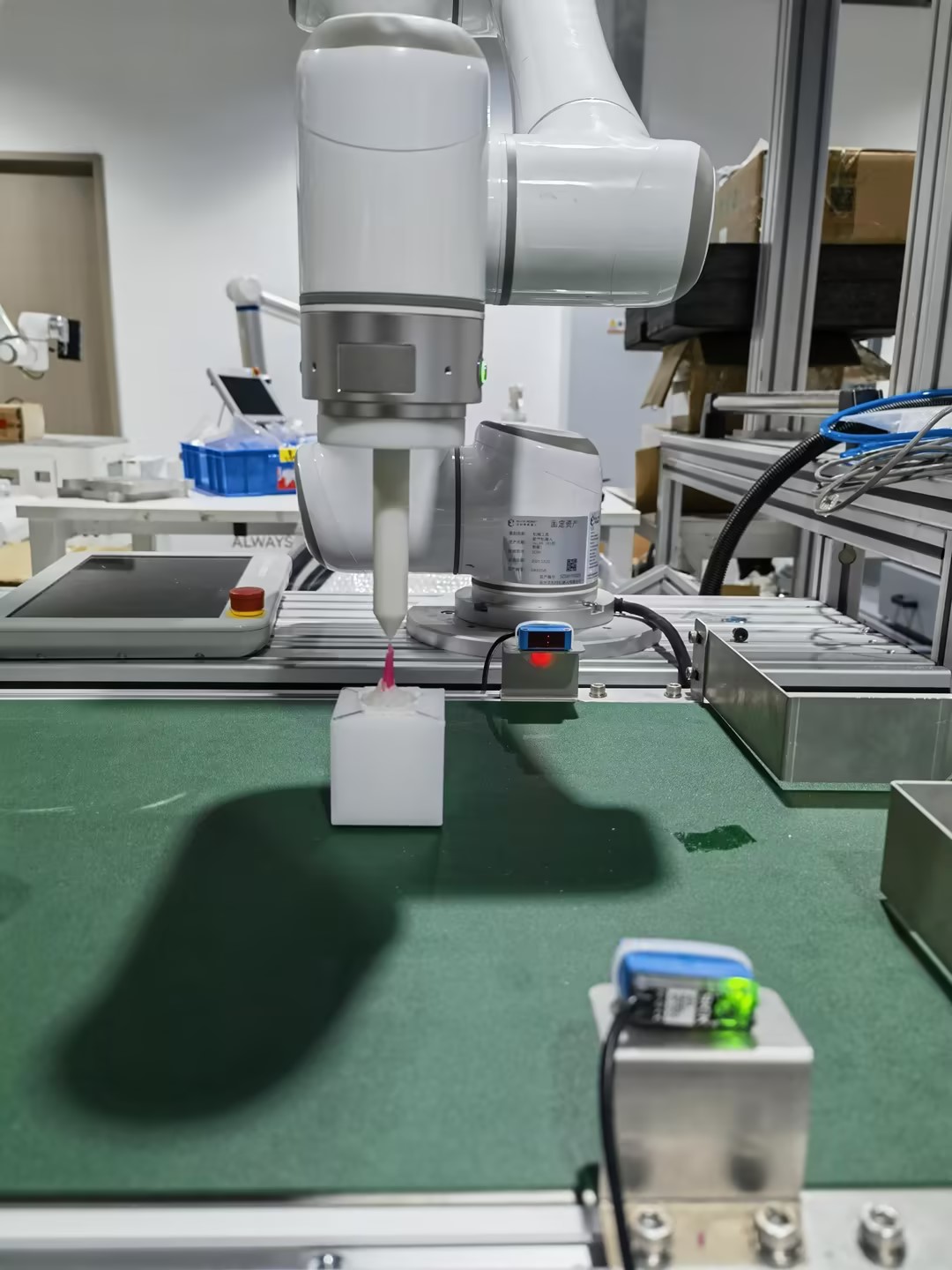 示教完跟蹤軌跡后將傳送帶緩慢開動一段距離后(設定的有效結束距離400mm以內,最優300-350mm),停止傳送帶運動(傳送帶速度保持不變),將機械臂移動至B點并記錄B點(A點B點需戳向同一個特征點記錄),記錄A點和B點時,下面會顯示編碼器數值,