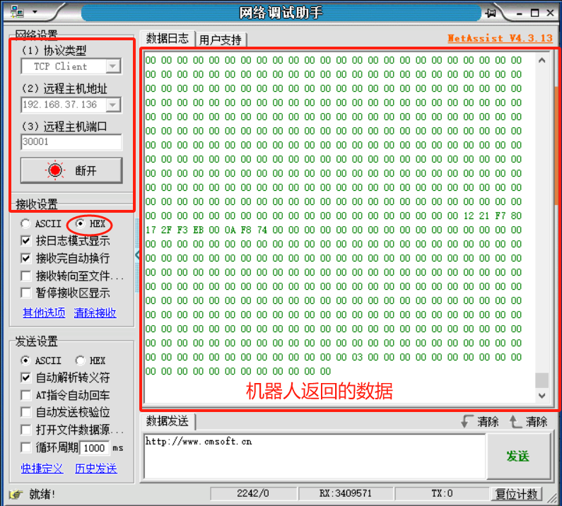 1.通過網絡調試助手連接CS機器人30001端口后,機器人會以 10HZ 的頻率向 30001 端口 發送數據,如圖2-1-1所示:為機器人FB1網口IP,以16進制格式接收。