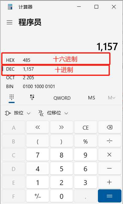 2.首先我們需要找到報文頭,因為調試助手是以十六進制接收機器人返回的數據,”機器人狀態報文表”中的報文的長度和報文類型(16)數據為十進制,所以首先把整個報文長度(1157)和報文類型=(16)轉換為16進制,方便尋找報文頭,十進制1157轉換成十六進制為 ”485“ 又因為報文頭在數據中占四個字節所以整個報文頭長度為”00 00 04 85“,十進制16轉換成十六進制為“10”,如圖2-1-3: