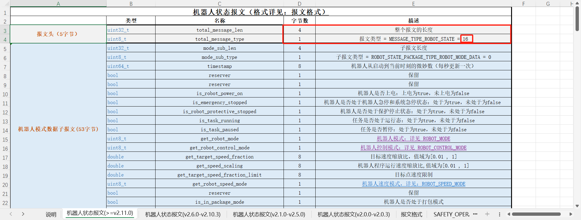 1.通過”機器人狀態報文表”得知機器人狀態數據總共有1157位字節(5+53+347+101+445+88+10+37+43+28=1157),其中報文頭:前面4位字節為報文長度,第5位字節為報文類型=16。