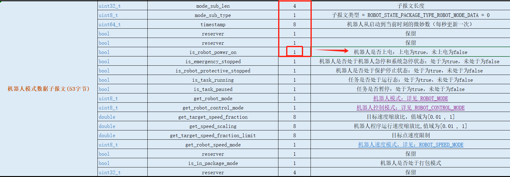 3.解析”機器人是c)“后再次去掉”子報文類型(1個字節)“還剩48個字節=數據C,通過”機器人狀態報文表”得知”機器人是否上電“位于”機器人模式”報文中的第16位,由于數據C中已經去掉子報文頭(“子報文長度4個字節”和子報文類型1個字節),因此機器人是否上電“位于數據C中的第11位,所以需要把C[10:11]換成成整數后判斷是否為1,為1時機器人已上電,為0時機器人已下電;