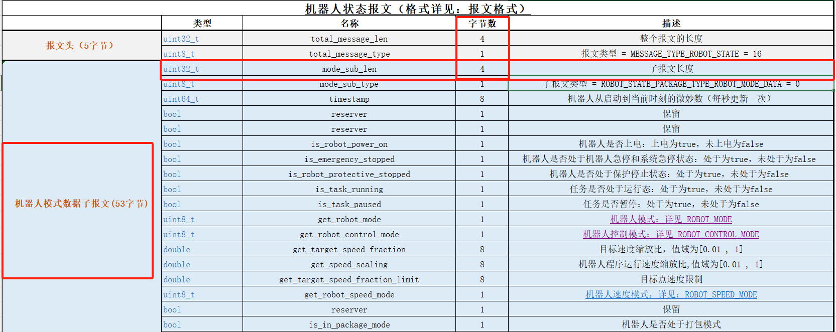 1.當我們需要解析機器人的某一種狀態時,首先需要找到這個狀態的子報文頭即可,例如通過”機器人狀態報文表”得知”機器人模式”子報文長度為53且占4個字節如圖2-1-5所示,所以轉換成十六進制為“00 00 00 35”。