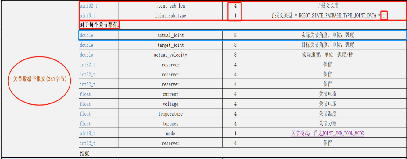 1.當需要解析機器人實際關節角度時,一樣的方法首先需要找到關節數據的子報文頭,通過”機器人狀態報文表”得知”關節數據”子報文長度為347字節且占前面4個字節,子報文類型為1占第4個字節,如圖2-1-9所示,所以轉換成十六進制分別為“00 00 01 5B”,”01“。