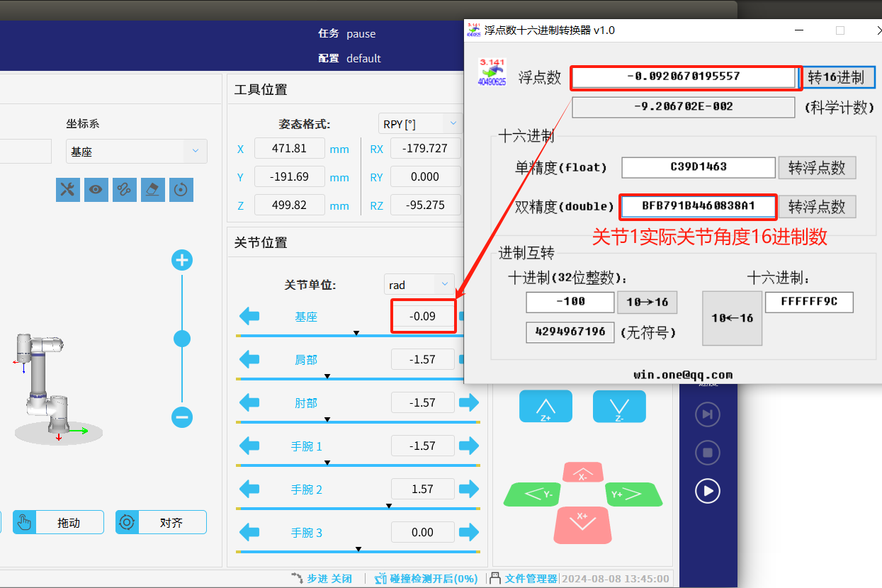 6. 通過”浮點數十六進制轉換器“對每個關節實際角度數據依次進行轉換得: