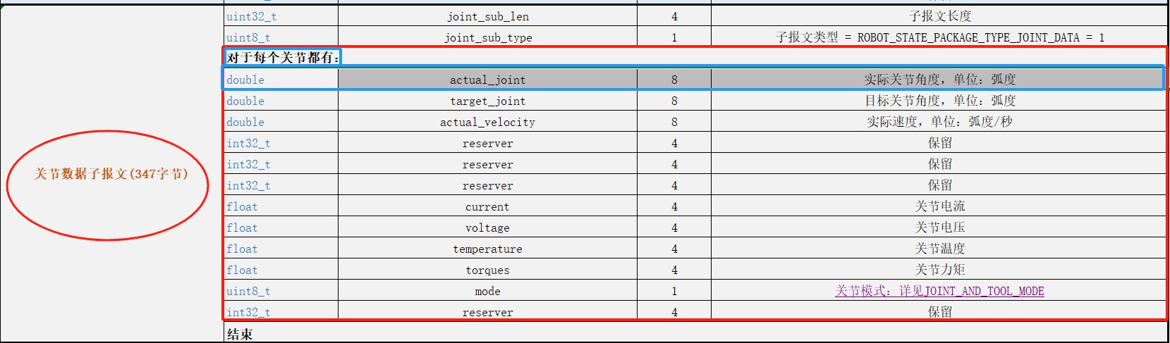 3.由圖2-1-9可知關節數據中的347字節中前面五個字節為子報文頭,報文頭后面分別為六個關節的數據每個關節數據有57個字節:子報文頭(5)+關節1數據(57)+關節2數據(57)+關節3數據(57)+關節4數據(57)+關節5數據(57)+關節6數據=關節數據(347),為了便于解析每個關節的數據以顏色區分如圖2-1-11所示: