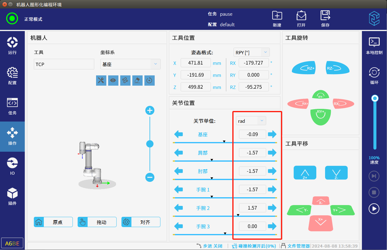 四舍五入保留兩位小數后與機器人示教器上顯示的數據一樣說明解析正確,如圖2-1-14,單位(弧度)。