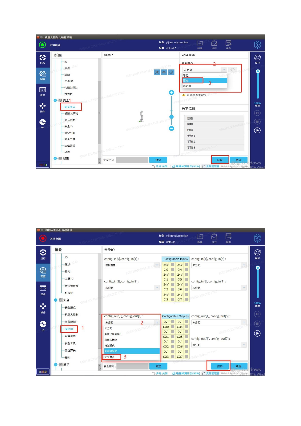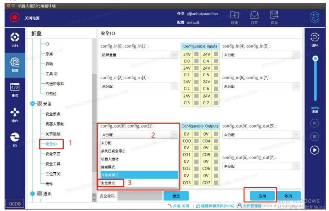 最后在【配置】【安全】【安全 IO】中選擇可配置輸出 IO,選擇其中一組信號,然后配置成需要的安全原點信號,這樣就可以機器人處于原點位置時,可以在可配置 IO 輸出的端口讀到輸出信號。