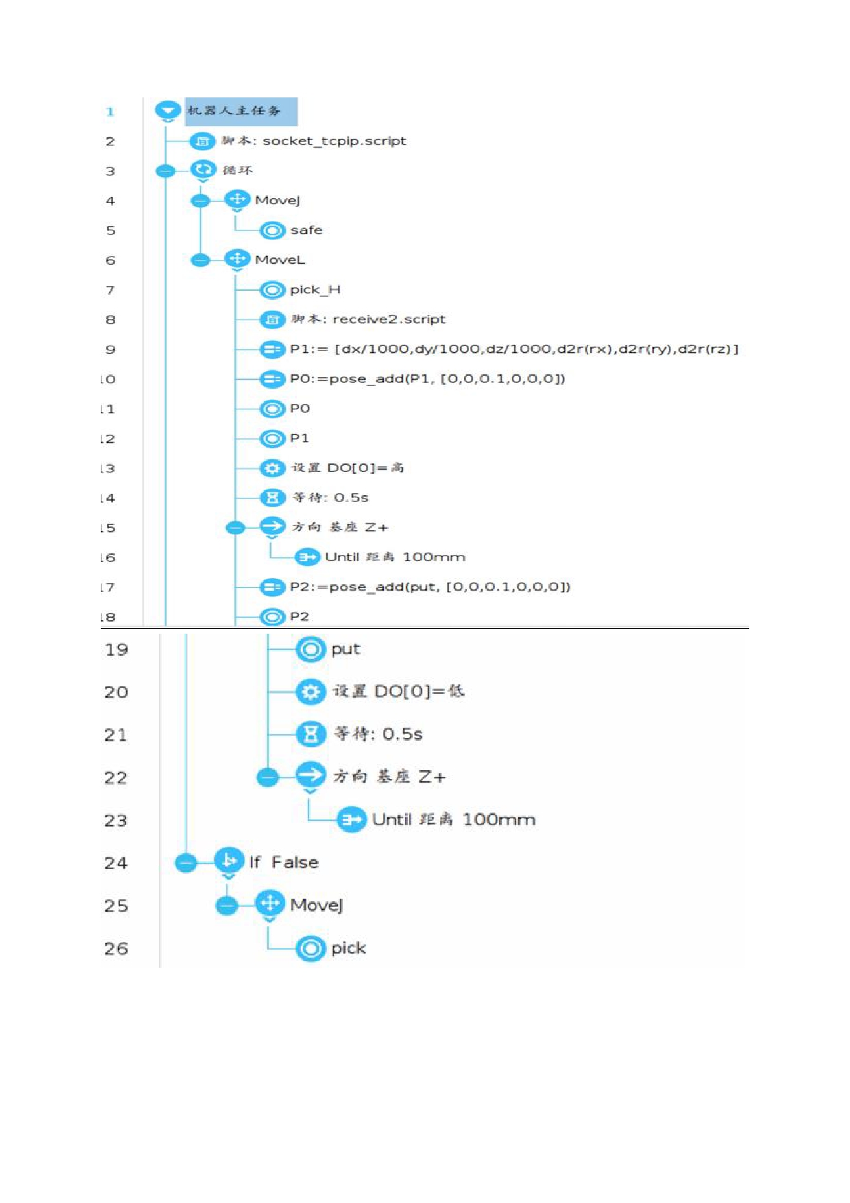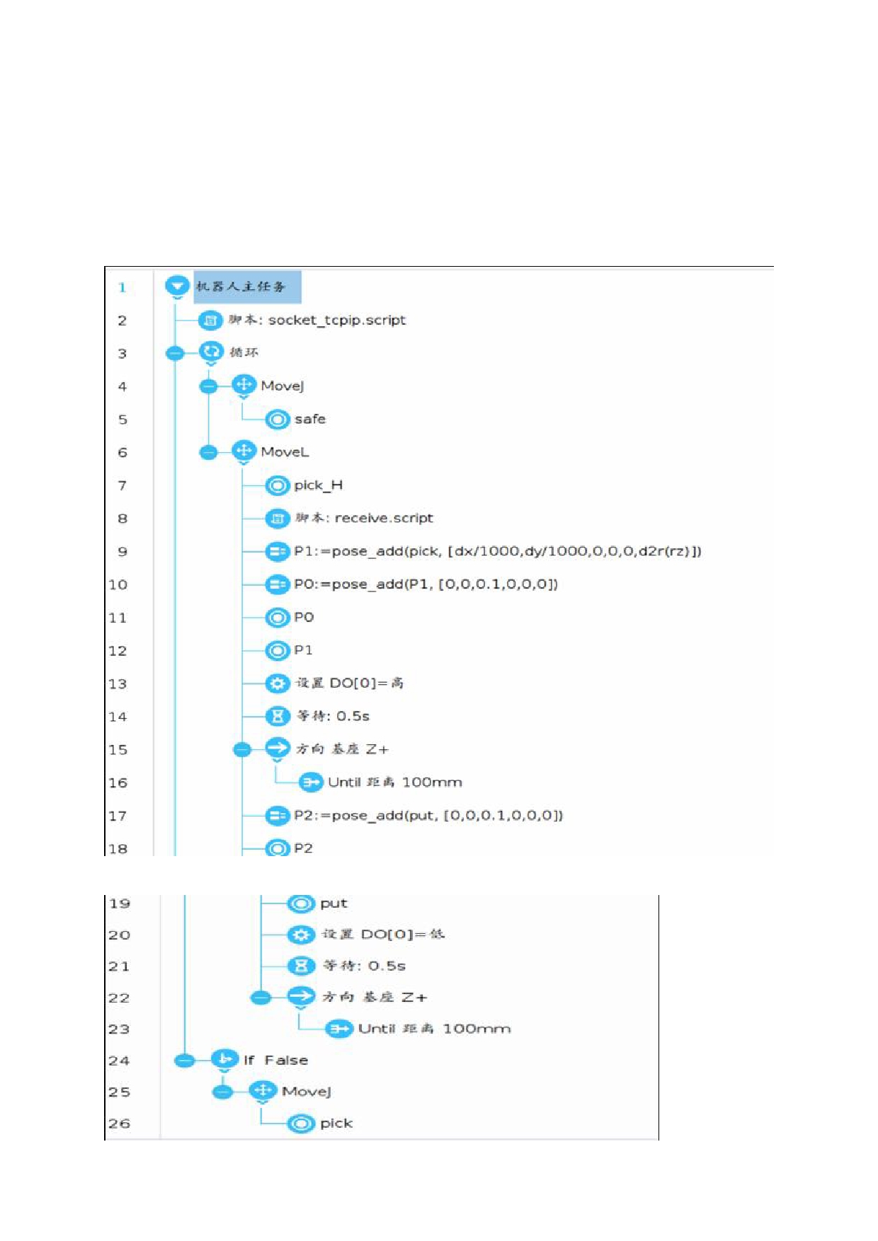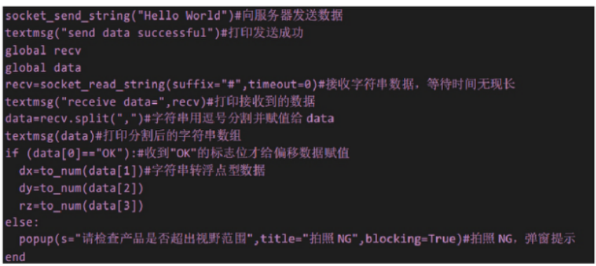 接收視覺坐標腳本程序 receive.script 如下圖 6。視覺發過來的數據按照:"OK,1,2,3#"格式,第 1 位數代表標志符,拍照成功發送"OK",拍照失敗發送"NG";第 2,3,4 位數分別是 X,Y,RZ 方向的偏移,數據用","隔開,末尾用"#"作為結束符。