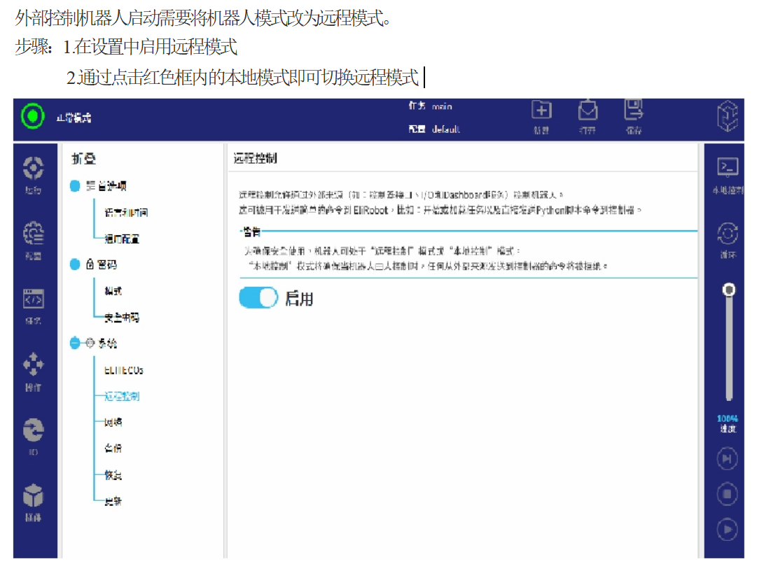 外部控制機器人啟動需要將機器人模式改為遠程模式。