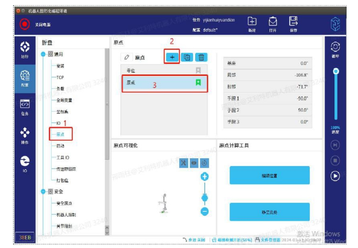 3.1 首先【配置】【通用】里面找到【原點】 置一個機器人原點,根據現場實際情況進行設置,后期修改原點也可直接編輯位置。