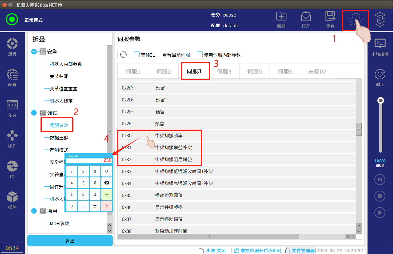 7.開始采集波形時,機器人會進入產測模式,調整參數完成后需要手動推出產測模式