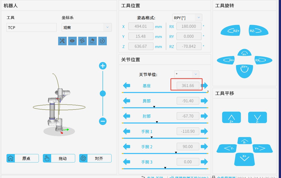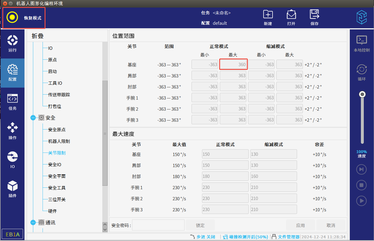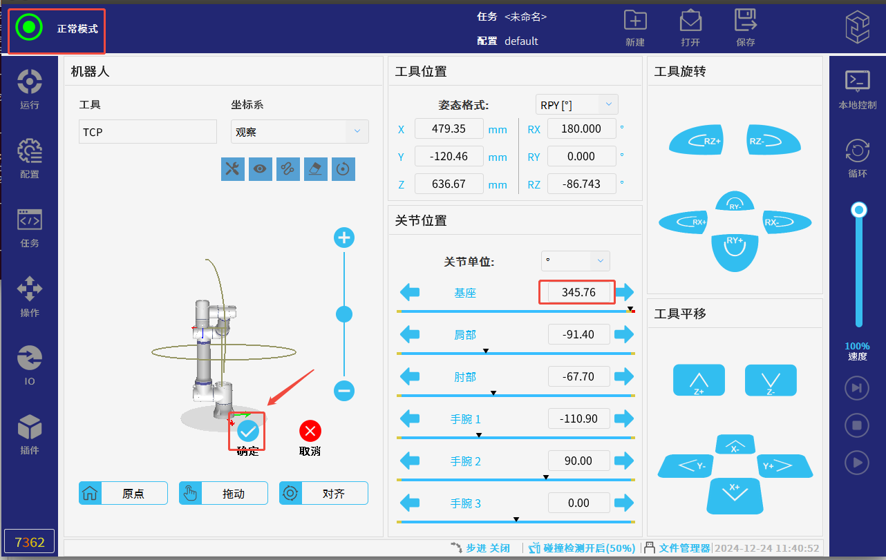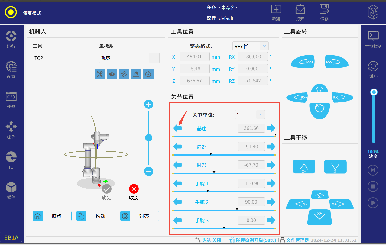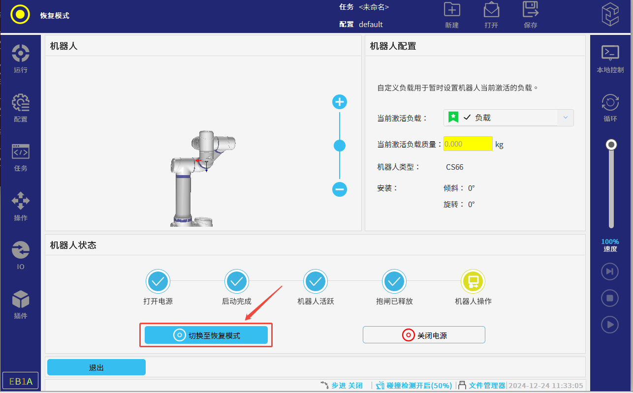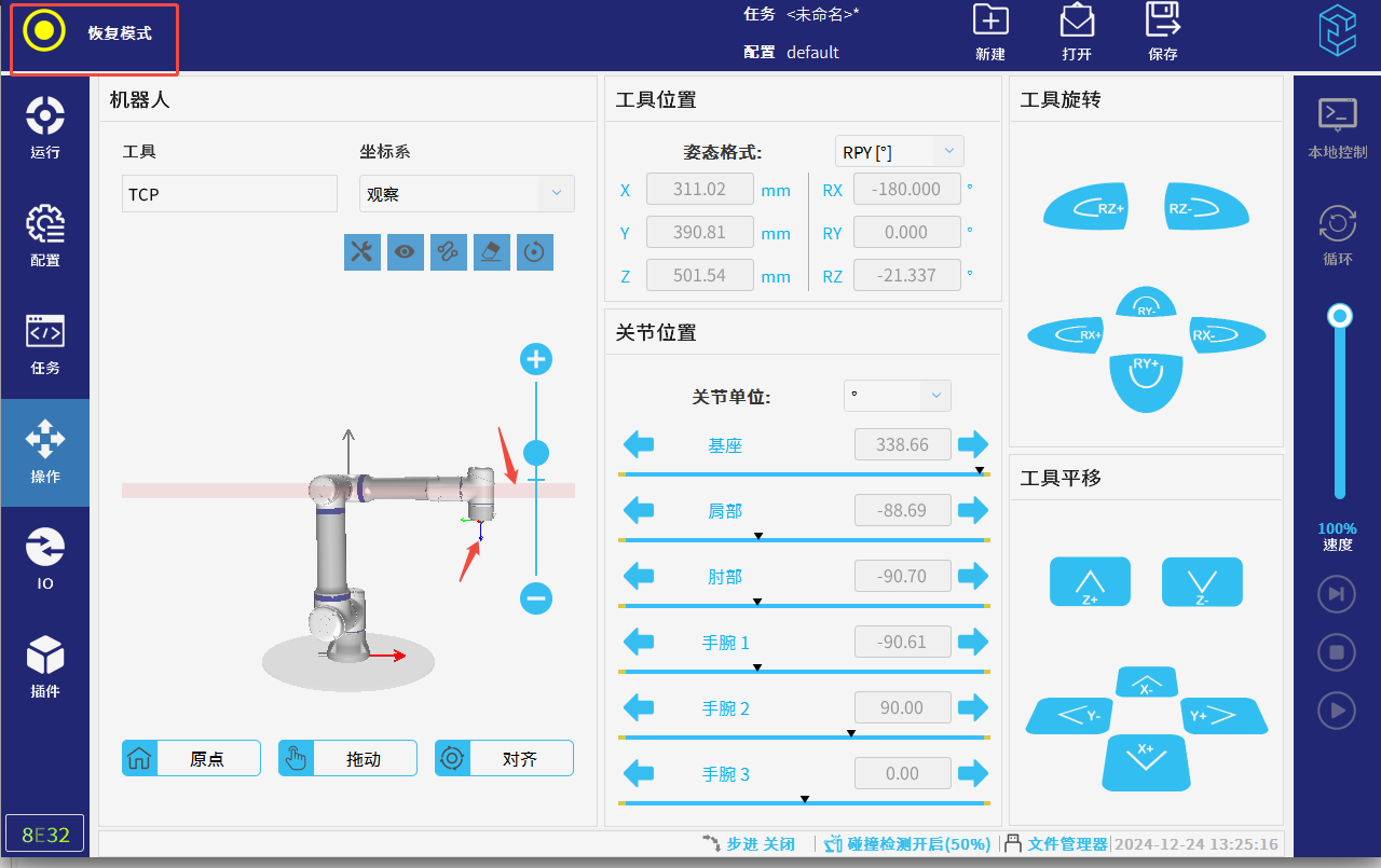 此時機器人的基座已經(jīng)在關(guān)節(jié)限制內(nèi),左上角恢復正常模式,點擊確定按鈕即可退出恢復模式