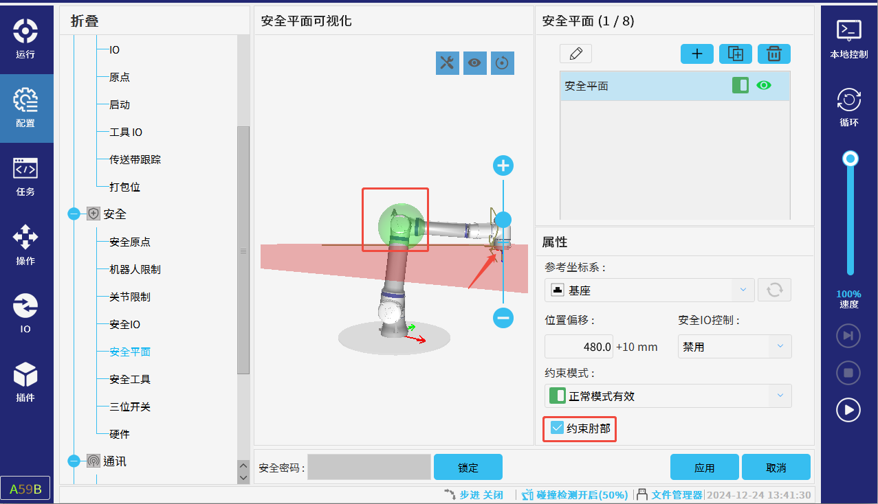 設(shè)置安全平面時可以選擇勾選或者不勾選“約束肘部”(勾選了會在肘部有個球體),如果勾選了則需要把肘部連同末端TCP一同脫離安全平面,如果沒有勾選則只需要把末端TCP脫離安全平面,操作方法如同2.1