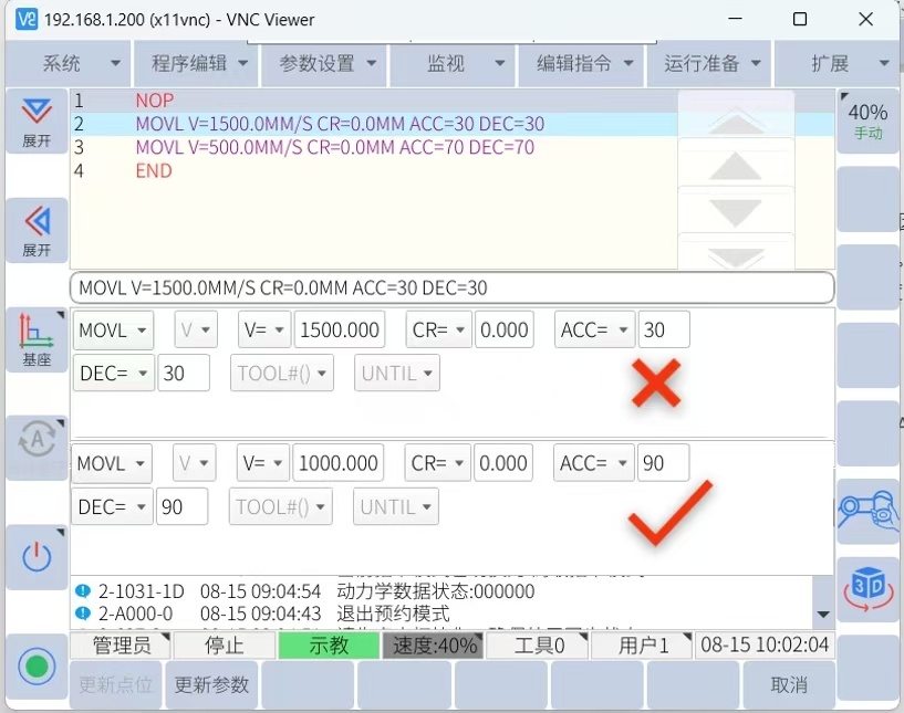 速度設置不合理會造成機械手運動不流暢,或加速度變化過大引起機器人震動,因此,在機器人速度設置中要合理,直線速度建議加速度ACC最大95 ,速度最大1500mm/s 。 建議最大關節速度VJ 95,關節加速度ACC最大95(應當根據兩點距離來調整速度與加速度,才能達到最優速度)如下圖所示: