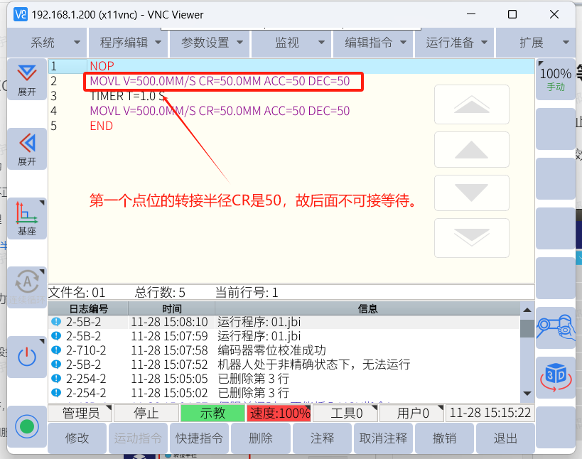 當CR不為0 ,且后面有延時或者條件等待時,機器人會轉彎時快速停止 ,就可能造成抖動或者出現其他報警 ,長期這樣也會對減速器損傷。如圖所示:
