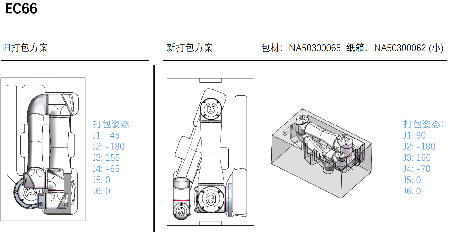 4. 運輸過程中需要機器人的2、3軸不要受力,有支撐,合理的打包姿態運輸能能夠有效的避免機器人抖動。打包姿態如圖: