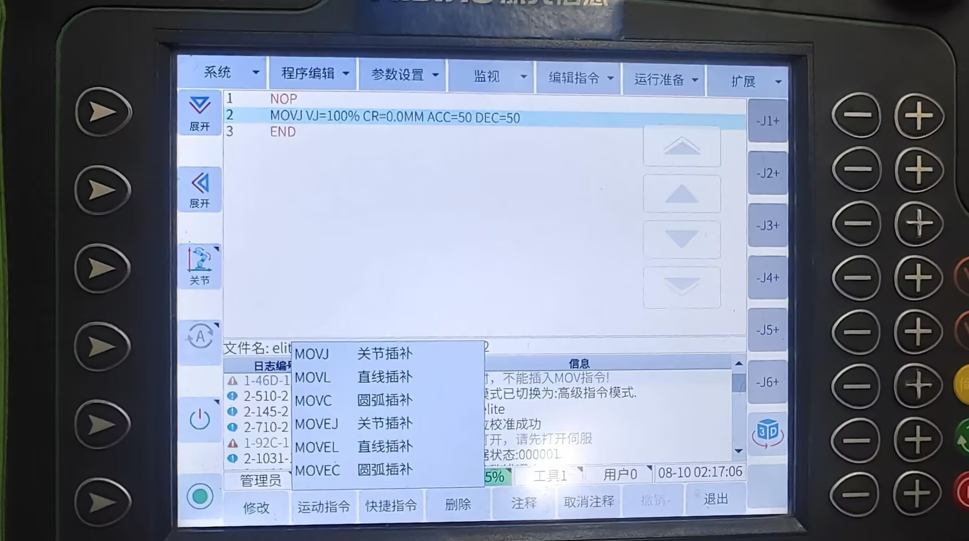 完成上述所有準(zhǔn)備工作后,首先按下示教器右下角的“伺服使能”按鈕 。伺服使能