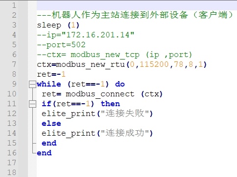 ModBus主站功能通過lua腳本實(shí)現(xiàn),可以參考EC-lua手冊(cè)進(jìn)行使用。其中MODBUS MASTER為已經(jīng)封裝的接口,用戶只需傳入相應(yīng)參數(shù)即可;如有其他特殊協(xié)議要求,可以使用TCP/UDP通訊、485通訊、TCI通訊(工具末端485)和232通訊等。