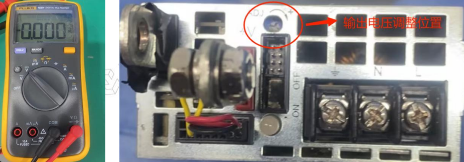 萬用表打到直流電壓檔測量 220V 轉 48V 電源電壓,若電壓過低可將電壓調至 48.4V 左右,過高可降低到 48.4v 左右,電源輸出電壓調整位置(如下圖),旋轉其調節,無需斷電,使用時注意安全!