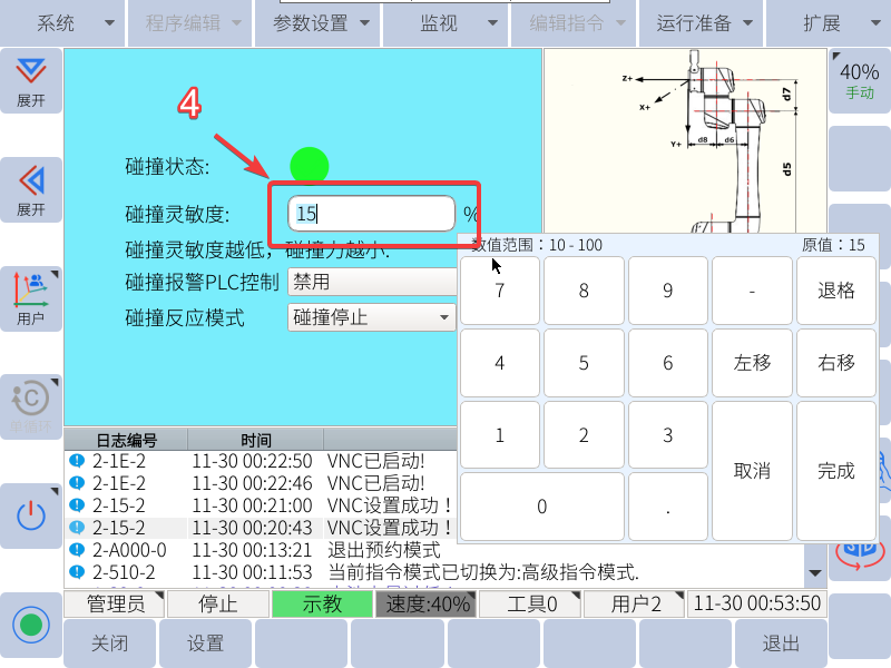 tips:機器人開啟碰撞檢測后,靈敏度設置的越小,代表機器人越靈敏,觸發機器人“碰撞檢測報警”所需要的力便越小,碰撞檢測是檢測電流的大小,靈敏度設置過高,易引發碰撞報警誤報,可根據實際情況,設置合適的靈敏度值。