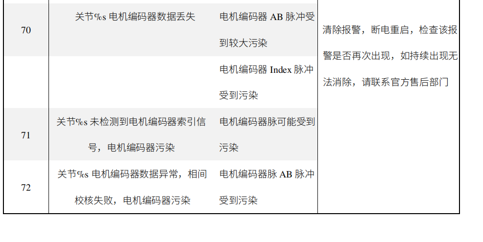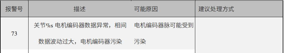 當機器人出現報警70,71,72,73當中的任意一個代碼時,可以按照用戶手冊上的故障代碼進行斷電重啟操作,若重啟后任然報警則表示機器人光編可能出現了污染,可以對其進行屏蔽,如果屏蔽后出現其他報警代碼或者點位不準的現象則需聯系廠家進行返廠維修。