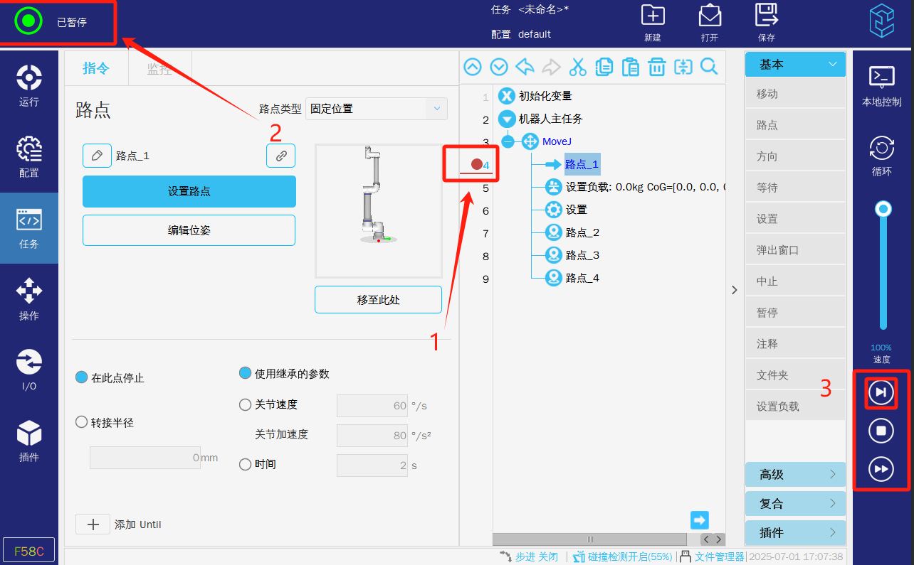 1. 在任務(wù)里選擇需要單步的語句行,選擇“基本”