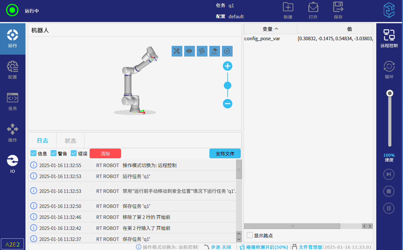 客戶應(yīng)用場景中可能會要求使用 SDK 來開發(fā),下面介紹 SDK 啟動機(jī)器人方法,過程中請保持機(jī)器人為遠(yuǎn)程模式,與示教器操作大體一致只是以代碼的形式分步執(zhí)行,打開電源,釋放抱閘等功能,至機(jī)器人處于正常模式后運(yùn)行。