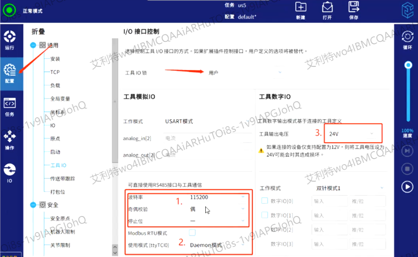 3. 安裝好后設置工具IO的參數,工具輸出電壓,波特率,奇偶校驗,以及使用模式,不同品牌的力控傳感器參數設置不同,這個需要注意。如下圖:
